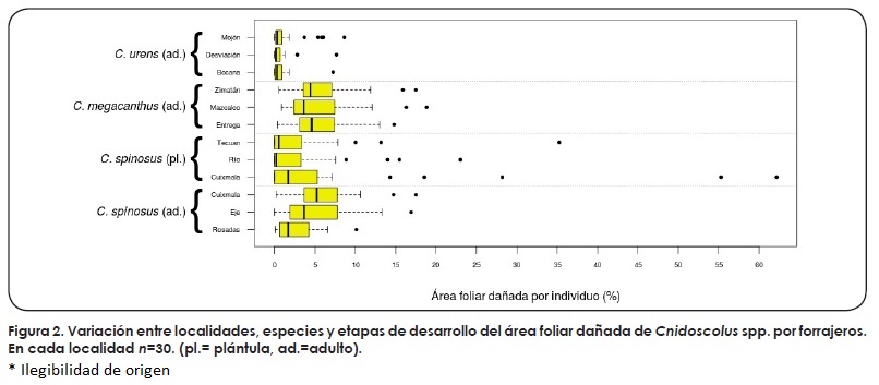 =1.53%, e.e.=0.05, n=30). Cnidoscolus urens presentó niveles de daño promedio bajos y similares entre localidades (Fig. 1; Kruskal-Wallis, χ2=2.1, ν=2, P =0.34).