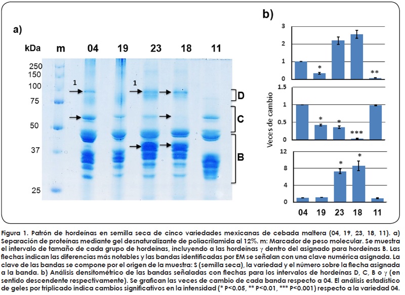 Para cada uno de los triplicados de semilla seca, las bandas seleccionadas de hordeínas D, C y B o γ se cuantificaron por densitometría en un equipo Chemidoc MP System con el software Image Lab (Bio-Rad, México, D.F.). Se obtuvieron los valores de intensidad total de cada carril y de las bandas seleccionadas en unidades arbitrarias. La intensidad de cada banda fue normalizada por la intensidad total del carril correspondiente para calcular las veces de cambio respecto al valor de la variedad 04 (asignándose un valor igual a uno en este caso). Con estos datos se realizó un Análisis de Varianza (ANOVA) y t de Student para determinar si las diferencias entre variedades son significativas.