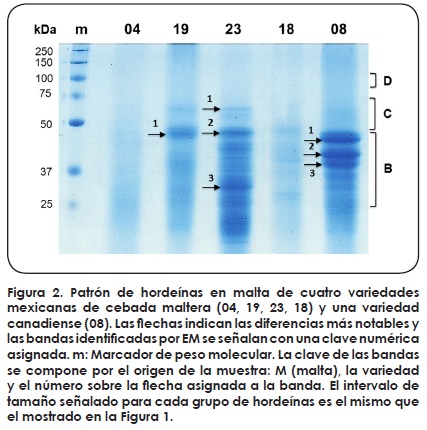 Se reportaron los patrones de hordeínas en geles SDS-PAGE de una dimensión de semilla seca y malta de variedades mexicanas de cebada. En semilla seca se observaron bandas diferenciales a 100 kDa, 65 kDa y de 37-45 kDa, por lo que se sugiere continuar con su análisis como candidatos a marcadores moleculares en la semilla. En malta destacaron los patrones de la variedad 08 y 23 por su abundancia en hordeínas, así como la 04 y 18 por la degradación de las mismas que muestra cada una. Por otro lado, para la identificación de hordeínas por EM, se determinó que la digestión con tripsina favorece la identificación de péptidos en muestras de malta, mientras que en semilla seca el uso de tripsina modificada puede ser utilizado con éxito en la identificación de hordeínas B y γ y solamente la digestión conjunta de tripsina con quimotripsina favorece la identificación de las hordeínas C.
