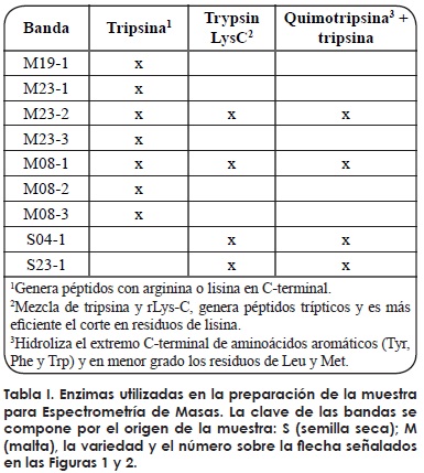 Se ha reportado en diversos estudios que las prolaminas pueden presentar problemas de identificación por la dificultad de ser digeridas por la tripsina, comúnmente utilizada en estudios de proteómica. Con el fin de evaluar con qué enzimas se mejoraba la identificación de las hordeínas por EM, se siguieron dos protocolos distintos además del estándar con tripsina (Tabla I). Uno de éstos fue realizado acorde a Colgrave y colaboradores3 quienes reportaron un protocolo de digestión secuencial utilizando tripsina y quimotripsina, que permitió la identificación por EM de proteínas distintas a las encontradas usando únicamente tripsina. Cabe mencionar que algunas de las muestras correspondientes a las bandas seleccionadas fueron tratadas por los tres protocolos (M23-2 y M08-1), mientras que otras se trataron con uno o dos de estos procedimientos (Tabla I).