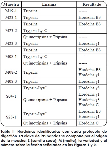 En la Tabla II se observa que utilizando el protocolo de digestión únicamente con tripsina se identificaron principalmente las hordeínas B3 y γ1. Utilizando la mezcla Trypsin-LysC de Promega grado EM, se incrementó la eficiencia de corte en los sitios de lisina, por lo que se logró identificar además a la hordeína γ3. Finalmente, al realizar la digestión secuencial con quimotripsina y tripsina, se identificaron las hordeínas C aunque solamente en las bandas correspondientes a semilla (Tabla II). La hordeína B3 fue identificada en varias de las bandas analizadas, lo que corresponde a proteínas de diferente tamaño e incluye las bandas M23-1, S04-1 y S23-1 de tamaño mayor al esperado para este grupo de hordeínas (Figura 1). Por otro lado, en la banda M19-1 no se identificaron hordeínas, pero sí otro tipo de proteínas (datos no mostrados) importantes en el proceso de malteo. La diversidad de hordeínas identificadas fue mayor para las muestras de semilla madura (Tabla II).