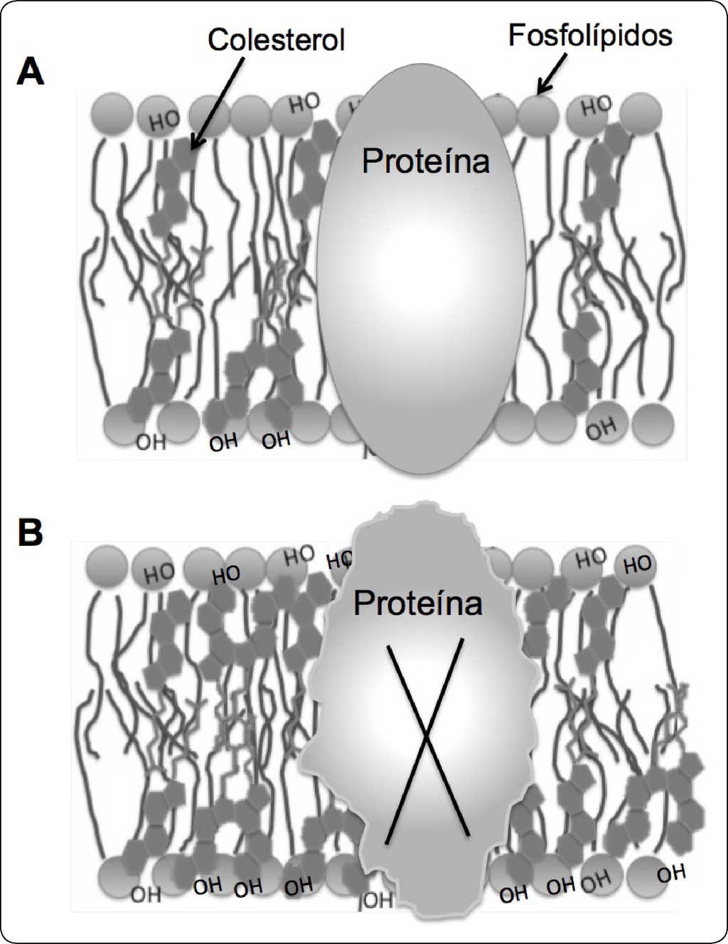 Figura 2 El aumento de colesterol en la membrana altera su estructura. (A) El colesterol se encuentra anclado estratégicamente en las membranas de la célula, donde modula la fluidez y permeabilidad. La molécula de colesterol constituye el elemento estructural básico del esqueleto de las membranas celulares, sin su refuerzo las membranas serían extremadamente fluidas y perderían su consistencia. (B) El aumento de los niveles de colesterol en la membrana afecta la organización y sus propiedades físicas, lo que disminuye la fluidez y aumenta la rigidez. En consecuencia, estos eventos afectan negativamente a ciertas proteínas transmembranales, las cuales requieren libertad conformacional para realizar sus funciones de manera apropiada. Basado en 21,112.