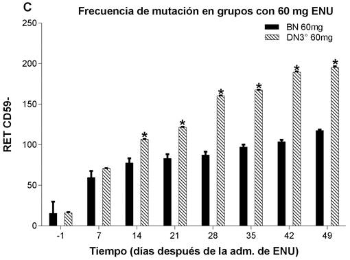 Con la dosis de 60 mg ENU se presentaron diferencias significativas a partir del día 14 y hasta el día 49, siendo el grupo DN3° el que presentó la mayor FM. Estos datos sugieren que la dosis de 60mg de ENU, es lo suficientemente potente para inducir mutantes Pig-a y que son los animales con DN3° los más afectados con una dosis alta del mutágeno, a su vez, el grupo DN testigo muestra las frecuencias de mutantes espontáneos más altas; esto demuestra que el daño en el material genético se encuentra asociado a la deficiencia de nutrientes.