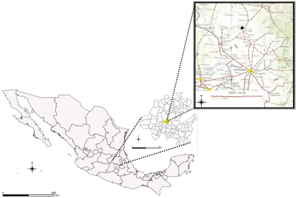 Zona de estudio. El área de trabajo de campo se localiza en la zona semiárida que forma parte del municipio de Santiago de Anaya, en el Estado de Hidalgo (Figura 1), dentro del denominado Valle del Mezquital. Este municipio se encuentra localizado en el paralelo 20° 23’31” longitud norte y el meridiano 98° 58’ 22” longitud oeste, a una altitud de 2054 msnm. El clima es seco con lluvias en verano, con una temperatura y precipitación promedio anual de 24 °C y 550 mm, respectivamente; la estación de lluvias ocurre de mayo a octubre y de noviembre a abril es la temporada seca (INEGI, 2000). El tipo de vegetación es matorral subinerme con dominancia de Flourensia resinosa y Mimosa depauperata. Es una zona semiárida donde las principales causas de deterioro son el sobrepastoreo, la tala de árboles y donde la mayoría de las especies palatables para el ganado ovino-caprino han sido desplazadas.
