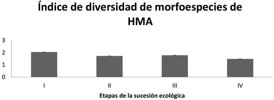 Figura 10 Índice de diversidad Shannon-Wiener de morfoespecies de hongos micorrizógenos arbusculares (HMA) en un matorral xerófilo, en el Valle del Mezquital, Hidalgo. I. Especies pioneras, II Especies intermedias tempranas, III. Especies intermedias tardías, IV. Especies maduras. Estadísticamente no se encontraron diferencias significativas (p<0.05).
