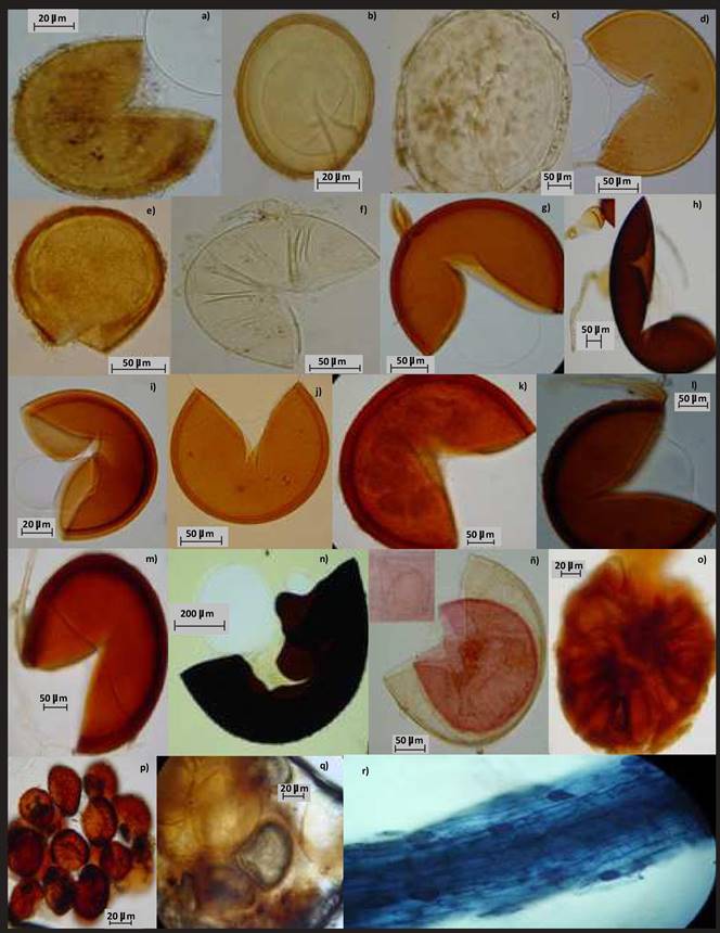 Figura 11 a) Acaulospora denticulata detalle de la ornamentación; b) Acaulospora sp. c) Diversispora sp. d) Claroideoglomus sp. e) Entrophospora infrequens con detalles de la ornamentación. f) Funneliformis mosseae con hifa en forma de embudo. g) Funneliformis geosporum con hifa en forma de embudo delgado y capa laminar gruesa. h) Gigaspora sp. y en el recuadro superior izquierdo se muestra la hifa bulbosa. i) Glomus caesaris; j) Glomus sp. 1. k) Glomus sp. 2. l) Glomus sp. 3. m) Glomus sp. 5. n) Racocetra gregaria. ñ) Scutellospora sp. y en el recuadro superior izquierdo se observa la hifa en forma de bulbo con reacción al reactivo Melzer de la capa interna. o) Sclerocystis sinuosa. p) Sclerocystis sp. 1. q) Sclerocystis sp. 2. r) Colonización micorrízica en raíz de Buchloë dactyloides, donde se aprecian hifas y vesículas.