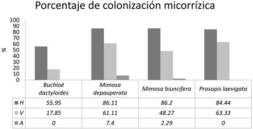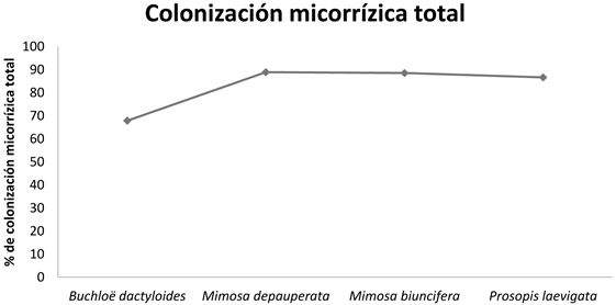 Porcentaje de colonización micorrízica. Los porcentajes de colonización obtenidos para gramíneas asociadas y para Buchloë dactyloides fueron altos (88%, 86%, 85% y 67%). Miller, Reinhardt & Jastrow (1995) reportan que en temporada de secas el micelio permanece principalmente por la presencia de plantas crasas (cactáceas, agaváceas y crasuláceas) y seguramente, por el aporte invernal de agua mediante el rocío matinal, mientras que la producción de raíces se reduce; por ello, el micelio puede facilitar las respuestas funcionales de desarrollo vegetal en condiciones de disponibilidad hídrica limitada en el perfil edáfico. Por ello y en el caso de la colonización radical por arbúsculos reportada en este estudio, su presencia puede deberse a que es la estructura donde ocurre el mayor intercambio de metabolitos entre plantas y HMA y en la temporada de secas las plantas están limitadas no sólo por el estrés hídrico, sino por una baja disponibilidad de nutrimentos como el nitrógeno y el fósforo. Barragán (2003) menciona que el porcentaje de colonización micorrízica indica el nivel de interacción entre fito y micobiontes, de tal manera que entre más alto sea el porcentaje de colonización fúngica, mayor influencia tendrá en el crecimiento y desarrollo de una planta; también reportó (op. cit.) un porcentaje máximo de 80% en plantas inoculadas en invernadero, lo cual es un porcentaje menor a los porcentajes de colonización micorrízica obtenidos en este trabajo para condiciones de campo. Esto significa, posiblemente, que los vegetales con elevados niveles de micorrización, mitigan el estrés hídrico y aumentan su crecimiento y vigor, según lo que reportan Rubio, Cepeda, Borie & Contreras (1997). El porcentaje de colonización micorrízica para Mimosa biuncifera fue del 88.5%; este valor podría estar relacionado con lo reportado por Cruz (2013), quien menciona que el micelio es importante para la funcionalidad de las plantas bajo condiciones de estrés hídrico, como lo han reportado estudios en los que la producción de micelio aumentó cuando hay baja disponibilidad de agua para las plantas (Khalvati, Hu, Mozafar & Schmidhalter, 2005; Bethlenfalvay, Brown, Ames & Thomas, 1998; Davies, Potter & Linderman, 1992). Este resultado es similar al obtenido por Hernández (2011), quien registró una colonización micorrízica para M. biuncifera de 70%, con un inóculo proveniente de una zona perturbada y 55% con inóculo de una zona conservada; asimismo, este valor se encuentra dentro del rango obtenido por Muñoz (2013), quien calculó porcentajes de colonización total micorrízica para diferentes especies vegetales de un matorral xerófilo, inoculadas en invernadero, comprendidos entre 80 y 94.9%. También, García-Sánchez, Monroy-Ata & Chimal-Sánchez (2007) reportaron una colonización del 54% en Mimosa depauperata. Por otra parte, para Prosopis laevigata se ha registrado una colonización micorrízica que varía entre 3.5% y 53% (Monroy-Ata, Peña-Becerril & García-Díaz, 2016; García-Sánchez, Monroy-Ata & Chimal-Sánchez, 2007).