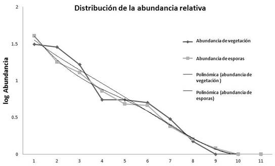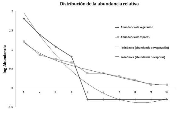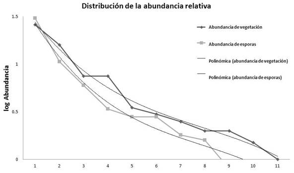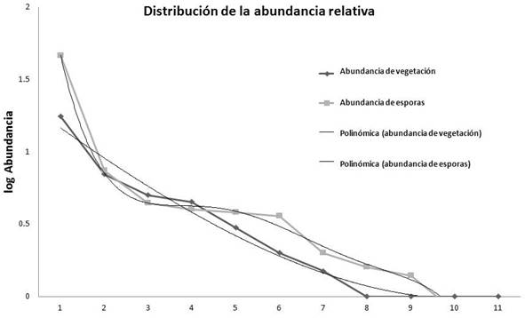 Distribución de la Abundancia Relativa. El modelo logarítmico de la abundancia relativa de las especies, agrupadas por rangos de frecuencia, muestra una dominancia de especies vegetales con mayor presencia por densidad o cobertura, lo que refleja un mayor control del flujo de energía solar, en las cuatro etapas serales analizadas. Para las comunidades de morfoespecies de HMA asociados a los cuatro mosaicos vegetales, se obtuvieron patrones de composición y abundancia semejantes a los de las plantas, ya que la silueta de las curvas es en forma de “S invertida”, aproximadamente, en ambos casos y para las cuatro etapas serales. Esto refleja una correspondencia entre ambas comunidades con especies dominantes y que tanto los fitobiontes como los micobiontes se encuentran vinculados mediante estructuras similares en distintos niveles de organización, ya que la forma de la curva de la distribución de abundancias relativas muestra la organización estructural, en composición y abundancia de especies, de una comunidad vegetal (Wilson,1999). Asimismo, Wilson (1999) menciona que el crecimiento de las plantas se ve afectado por otras especies vegetales con las que coexisten y por varios factores ambientales. Además, Monroy-Ata, Peña-Becerril & García-Díaz (2016) reportan que la estructura de la comunidad vegetal refleja la dinámica edáfica del agua, debido a los pulsos de precipitación y evapotranspiración, y a la distribución espacio-temporal del potencial hídrico del suelo, lo que explicaría la dominancia de especies vegetales denominadas nodriza (Monroy-Ata, Peña-Becerril & García-Díaz, 2016; Miller & Jastrow, 1992) en matorrales xerófilos y su estrecha relación con la red hifal de los HMA.