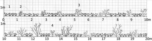 Figura 2 Perfil estructural vertical de la vegetación dominada por herbáceas perennes en un matorral xerófilo en el Valle del Mezquital, Hidalgo. 1 Buchloë dactyloides, 2 Flourensia resinosa, 3 Mimosa depauperata, 4 Opuntia cantabrigiensis.