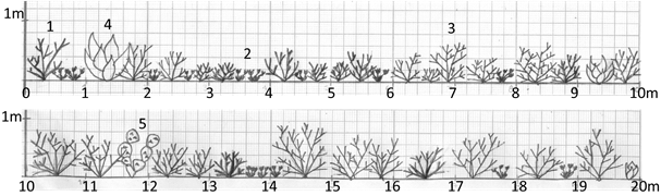 Figura 3 Perfil estructural vertical de la vegetación dominada por arbustos menores a 1 m en un matorral xerófilo en el Valle del Mezquital, Hidalgo. 1 Flourensia resinosa, 2 Buchloë dactyloides, 3 Mimosa depauperata, 4 Agave salmiana, 5 Opuntia cantabrigiensis.