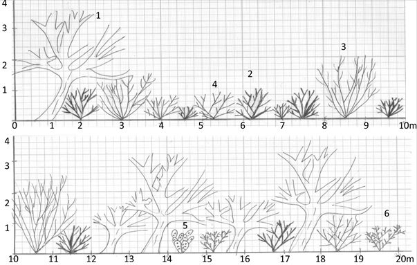 Figura 5 Perfil estructural vertical de la vegetación dominada por árboles en un matorral xerófilo en el Valle del Mezquital, Hidalgo. 1 Prosopis laevigata, 2 Flourensia resinosa, 3 Karwinskia humboldtiana, 4 Mimosa depauperata, 5 Opuntia streptacantha, 6 Condalia mexicana.