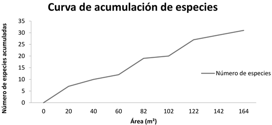 Curva de acumulación de especies. En este trabajo se registraron 31 especies vegetales, lo que puede indicar una riqueza baja en comparación con los estudios de Villavicencio, Pérez & Ramírez (1998) en los matorrales xerófilos de Hidalgo, en los cuales han reportado la presencia de 70 especies arbustivas o en otras comunidades similares como las estudiadas en Querétaro por Treviño & Hernández (2000), quienes reportaron 83 especies. Asimismo, las de Coahuila por Encina-Domínguez, Meave & Zárate-Lupercio (2013) que registraron 97 especies o las descritas en Tamaulipas por Alanís-Rodríguez et al. (2015) quienes reportaron 35 especies. Esto se puede explicar por ser un matorral xerófilo con signos de perturbación por sobrepastoreo, la menor superficie de muestreo y que éste se realizó sólo en la época seca del año. La familia mejor representada fue Fabaceae, con cuatro géneros. La curva de rarefacción calculada para estimar la riqueza de especies local mostró una eficiencia de muestreo del 93%; seguramente las plantas no registradas corresponden a especies palatables para el ganado, como las gramíneas. Esto permite explicar la relativamente baja diversidad vegetal del hábitat muestreado (Sonco, 2013).