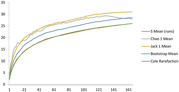 Riqueza de especies. La riqueza específica (S) se basa en el número de especies presentes, sin tomar en cuenta el valor de importancia de las mismas. Para esto se realizó una curva de acumulación de especies a partir del muestreo realizado en campo y una curva de rarefacción para estimar la diversidad alfa. La rarefacción implica construir una curva suavizada de acumulación de especies mediante un re-muestreo al azar de los datos. La curva fue realizada con el programa EstimateS 9 Windows (http://viceroy.eeb.uconn.edu/estimates).
