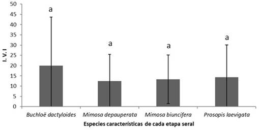 Figura 8 Índice de Valor de Importancia (IVI) de cuatro mosaicos vegetales de un matorral xerófilo. Los histogramas representan el valor promedio para cada etapa seral y las barras una desviación estándar. Las letras minúsculas iguales sobre los histogramas indican que no hay diferencias estadísticas significativas (p<0.05).