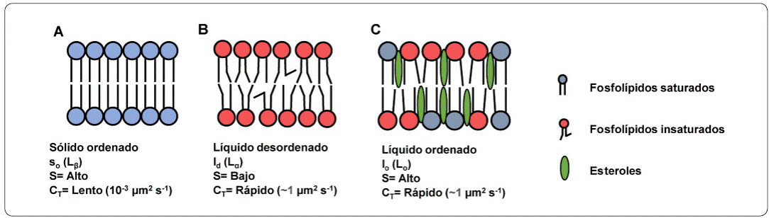 En la fase sólido-gel (Lβ) o también llamada sólido ordenado (so), las cadenas hidrocarbonadas de los lípidos muestran una configuración saturada y con alargamiento máximo, dando como resultado una red de lípidos extremadamente compacta y altamente ordenada (S) (Figura 1a); en consecuencia, la difusión lateral de los lípidos (CT) está fuertemente disminuida. Mientras que en la fase fluida (Lα) o también llamada líquido desordenado (ld), las cadenas hidrocarbonadas son generalmente insaturadas y menos extendidas (Figura 1b), por lo que la red de lípidos es laxa y poco ordenada, resultando en una CT y difusión rotacional de los lípidos alta. Debido a lo anterior, pueden existir diferentes grados de fluidez a lo largo de la membrana de acuerdo a la composición de la misma (Siontorou, Nikoleli, Nikolelis, & Karapetis, 2017; van Meer, Voelkner & Feigenson, 2008). Los esteroles, que se encuentran principalmente en las membranas biológicas de eucariontes, no son capaces por sí mismos de generar bicapas lipídicas. Sin embargo, cuando estos se intercalan en bicapas ya formadas pueden generar fases de líquido ordenado (lo) que tienen características tanto de la fase sólido-gel como la líquida (Figura 1c); esta fase es altamente ordenada, además los valores de CT y velocidad de difusión lateral son casi tan altos como en la fase ld pero mantienen grados de fluidez menores como en fase so (van Meer, Voelkner & Feigenson, 2008). Interesantemente, la mayoría de las membranas bacterianas carecen de esteroles en su membrana.