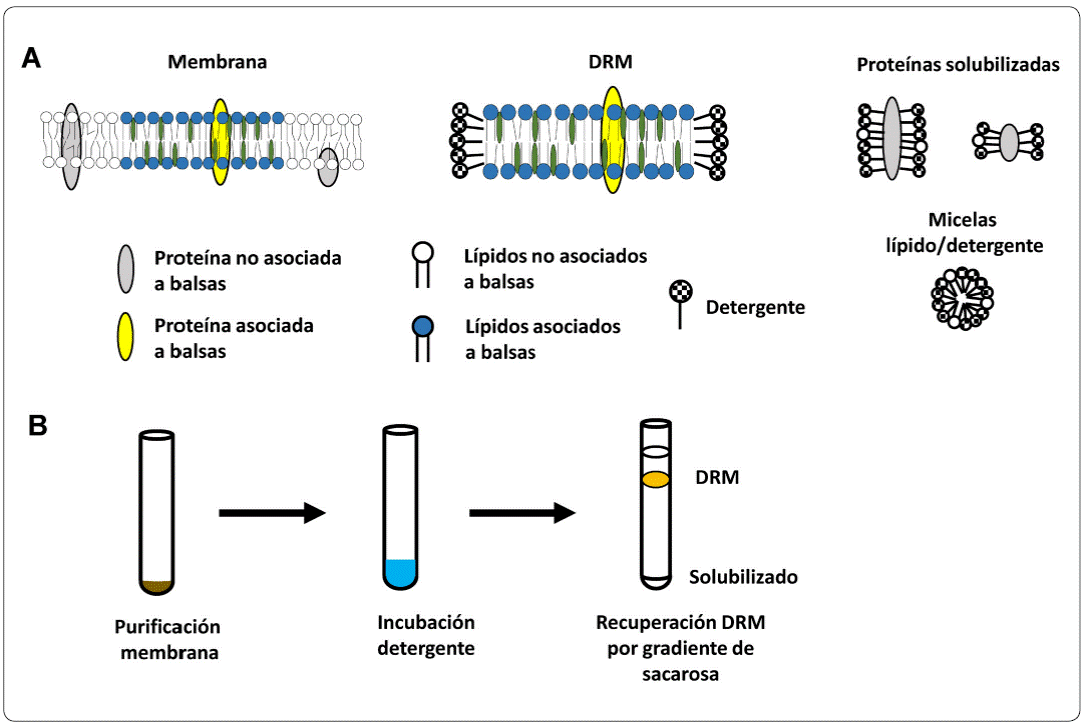 La herramienta más empleada para el estudio de la composición de dominios membranales es la extracción por detergentes no iónicos como el Tritón X-100. La técnica se basa en las propiedades físico-químicas que le permiten a la membrana mantener o perder su composición y estructura por tratamientos con detergentes. Esto se debe a que el tratamiento con detergentes puede afectar a la mayoría de las interacciones lípido-lípido de la membrana biológica, sin embargo, una pequeña porción de la membrana es capaz de resistir al tratamiento con detergentes y puede recuperarse como DRM (membranas resistentes a detergentes, acrónimo del inglés Detergent-Resistant Membranes) (Brown, 2006) (Figura 2a). Se ha sugerido que los DRM preparados con Tritón X-100, posiblemente se originan al extraer la fase lo de la membrana debido al alto empaquetamiento de los lípidos (Brown & London, 1998). También, la extracción por detergente es capaz de alterar las interacciones lípido-proteína, de tal manera que gran parte de las proteínas de membrana se solubilizan. Por otro lado, sólo algunas proteínas conservan su asociación con los lípidos y pueden recuperarse en DRM. La asociación de una proteína-lípido en forma de DRM puede indicar una fuerte interacción de la proteína con los dominios de fase lo (Brown & London, 1998). Por lo tanto, uno de los primeros métodos para la caracterización bioquímica de las balsas lipídicas fue el análisis de las fracciones enriquecidas en DRM.