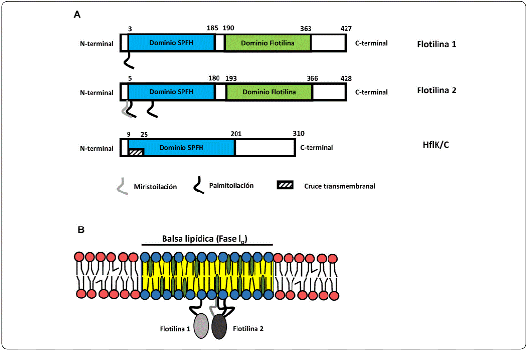 Las flotilinas son proteínas recurrentemente identificadas en los DRM obtenidos de diferentes tipos celulares. Estas proteínas pertenecen a una superfamilia que se caracteriza por contener el dominio SPFH (Stomatin, Prohibitin, Flotilin y HflC/K) o también conocido como dominio PHB (Prohibitin) (Tavernarakis, Driscoll, & Kyrpides, 1999). Proteínas con este dominio tienen funciones diversas en distintos organismos y tejidos, pero comparten la particularidad de comportarse como proteínas membranales con la capacidad de oligomerizar para formar microdominios. Las células de mamíferos tienen dos flotilinas, denominadas Flotilina-1 (Flo-1) y Flotilina-2 (Flo-2), que tienen una identidad de aminoácidos de alrededor del 50%. El dominio SPFH de Flo-1 y Flo-2 constituye la mayor parte del extremo N-terminal, mientras que en el extremo C-terminal se encuentra otro dominio altamente conservado sólo en las familias de las Flotilinas y no en otras proteínas con dominio SPFH (Otto & Nichols, 2011) (Figura 3a). Este último dominio contiene una región alfa-hélice que participa en la oligomerización para formar homo- y hetero-tetrámeros estables (Figura 3b) (Solís et al., 2007). Curiosamente, Flo-1 y Flo-2 carecen de cruces transmembranales, y se asocian a la membrana por modificaciones postraduccionales, particularmente miristoilación y palmitoilación (Neumann Giesen et al., 2004). Como parte integral de las balsas lipídicas, las Flotilinas tienen diversas funciones, como son participar activamente en la formación y mantenimiento de la propia balsa lipídica, actuar como potenciadores y moduladores de las actividades de las cinasas, además de ser chaperonas y contribuir en la regulación de canales iónicos (Browman, Hoegg & Robbins, 2007). Debido a que estas proteínas son componentes invariables de las balsas lipídicas, suelen ser usadas como marcadores de estos microdominios membranales.