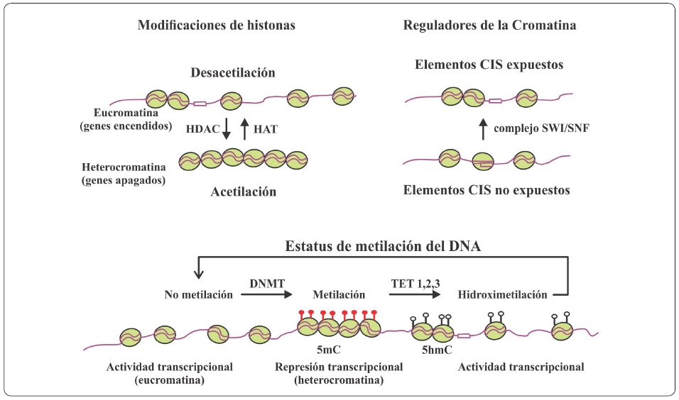 La compactación de la cromatina puede ser promovida o inhibida por modificaciones epigenéticas que son inducidas por diferentes factores biológicos y ambientales. Además, las modificaciones epigenéticas podrían influir en la personalidad y habilidades de los individuos (Tabla I). La epigenética (epi, del griego, que significa en/sobre), hace alusión a los cambios heredables en la expresión de los genes que no están asociados a la secuencia del DNA, sino a la conformación de la cromatina. Cada organismo tiene un epigenoma particular y a su vez cada grupo celular tiene su propio epigenoma que hace posible la activación y represión de genes específicos. Los ejemplos más visibles de la epigenética a nivel de un organismo se demuestran en gemelos monocigotos, que comparten la genética y sus rasgos fenotípicos, pero una epigenética distinta con diferentes personalidades, habilidades e incluso enfermedades. Al respecto, se han reportado diferencias en el perfil de metilación del DNA genómico, el patrón de acetilación de histonas y el transcriptoma de gemelos monocigotos durante su etapa adulta (Fraga et al., 2005). Los mecanismos epigenéticos permiten la adaptación al ambiente y son importantes en la salud y en procesos fisiológicos como el envejecimiento, pero también están implicados en el desarrollo de enfermedades, como las neurodegenerativas (Chen et al., 2017; Pal & Tyler, 2016; Yan, Matouk & Marsden, 2010).