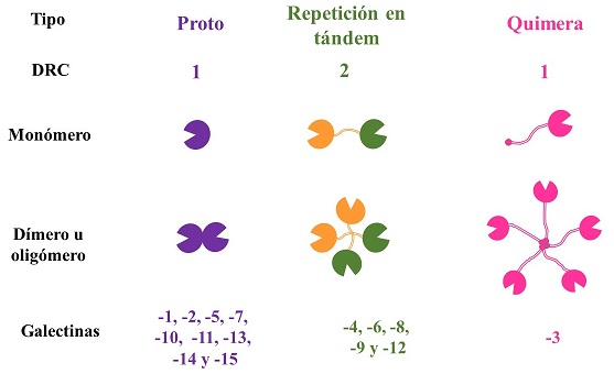 Las galectinas pueden tener efectos contrarios entre ellas, así, la Gal-1 inhibe la desgranulación de mastocitos y la migración de los leucocitos, mientras que, la Gal-3 promueve la desgranulación de los mastocitos y migración leucocitaria. En mamíferos, las galectinas se clasifican en tres tipos con base en la organización de su dominio y son numeradas siguiendo el orden de su descubrimiento. El primero corresponde a las galectinas proto o prototipo, que, usualmente forman homodímeros, donde cada subunidad contiene 1 DRC. Este tipo incluye a la Gal-1, -2, -5, -7, -10, -11, -13, -14 y -15. La Gal-5 es la única de este tipo que no forma dímeros. El segundo tipo corresponde a las galectinas de repetición en tándem, en las cuales 2 DRC distintos se unen mediante un péptido de enlace de longitud variable. Este tipo se compone de la Gal-4, -6, -8, -9 y -12 y suelen ser monoméricas. Por su parte, la Gal-3, es la única galectina tipo quimera, que posee en su extremo C-terminal el DRC unido a una cola polipeptídica N-terminal rica en residuos de prolina y glicina, con la que forma oligómeros (Vasta, Feng, Bianchet, Bachvaroff & Tasumi, 2015; Dings, Miller, Griffin & Mayo, 2018). Las galectinas -5, -6, -11 y -15 no se encuentran en humanos. La Figura 1 muestra la clasificación de la galectinas en los mamíferos.