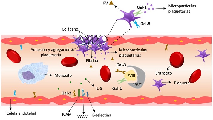 Quizás los hallazgos más importantes de las galectinas en el sistema de coagulación sean aquellos relacionados con el endotelio, ya que debemos recordar que son estas células las que dictan los caminos a seguir ante una lesión vascular o bien, cuando las células endoteliales son activadas. Resultados in vitro muestran que la Gal-8 activa al endotelio favoreciendo el aumento de la adhesión de las plaquetas, probablemente, debido al aumento de la expresión endotelial del VWF. Aunado a esto, la Gal-8 incrementa la expresión de las moléculas inflamatorias, como el ligando de quimiocina 1, factor estimulante de colonias de granulocitos y macrófagos, interleucina 6 y el ligando de la quimiocina 5, y en menor grado de la proteína quimiotáctica de los monocitos 1, ligando de quimiocina 3 e interleucina 8 (Cattaneo et al., 2014). El estudio muestra que la Gal-8 promueve la interacción entre los leucocitos, las células endoteliales y las plaquetas, tal y como ocurre en la inflamación, sin embargo, la interacción entre estas células acontece también en el proceso hemostático, y en el peor de los escenarios, en la trombosis.