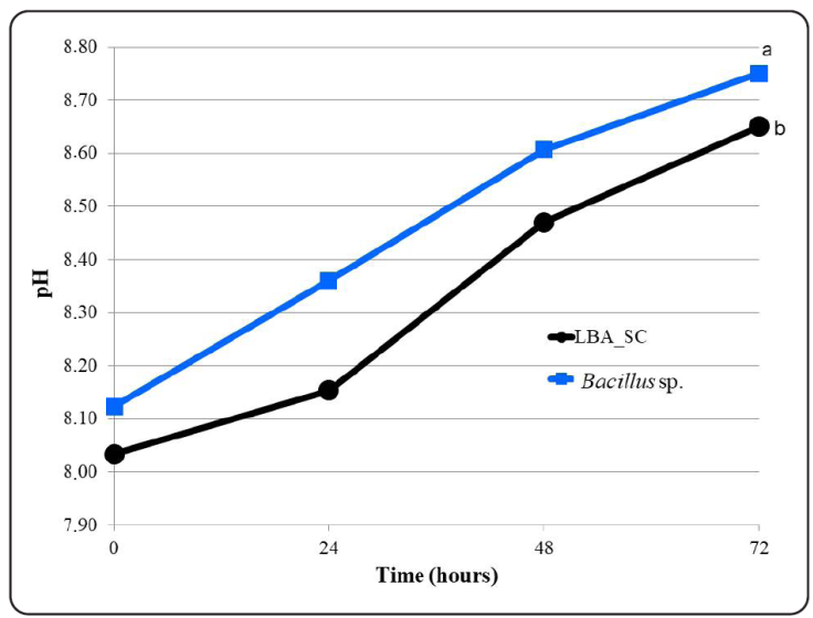 In the treatments studied, the pH increased reaching values of 8.65 for the mixture of isolate q11 and SC (MM1) and of 8.75 for MM2 (p < 0.05) at 72 hours, which, according to Chae-Woo, Yun-Seok & Kye-Heon (2009) and Nemutanzhela, Roets, Gardiner & Lallo (2014) can be attributed to the generation of bacteriocins, which release ammonium ions increasing the pH.