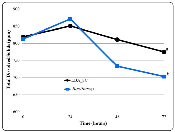 Figure 2 Comparison total dissolved solids values against time. Were measured the changes in the total dissolved solids concentration in the treatments [One of the treatments was a mixture made up of an isolate of lactic acid bacteria (LAB) identified as q11 and commercial Saccharomyces cereviseae; the other one was a microbial mixture of four (4) Bacillus species]. It was taking readings every 24 hours during the process time (from 0 to 72 hours). Three (3) repetitions were made per reading. Each point in the graph represents the mean of the repetitions. Fisher’s test of Least Significant Differences was applied to determine differences between treatments from each other. Different letters indicate significant differences (p < 0.05).