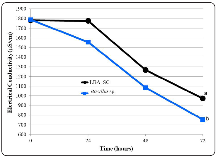 Figure 3 Comparison electrical conductivity values against time. Were measured the changes in the electrical conductivity values in the treatments [One of the treatments was a mixture made up of an isolate of lactic acid bacteria (LAB) identified as q11 and commercial Saccharomyces cereviseae; the other one was a microbial mixture of four (4) Bacillus species]. It was taking readings every 24 hours during the process time (from 0 to 72 hours). Three (3) repetitions were made per reading. Each point in the graph represents the mean of the repetitions. Fisher’s test of Least Significant Differences was applied to determine differences between treatments from each other. Different letters indicate significant differences (p < 0.05).