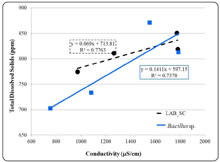 Figure 4 Lineal regression curves and correlation analysis between total dissolved solids and electrical conductivity in the studied treatments. Variations in the concentration of total dissolved solids were measured and readings were taken every 24 hours during the liquid waste treatment process (from 0 to 72 hours), to determine if there is a correlation with electrical conductivity. Each point on the graph represents the mean of the Three (3) repetitions. Likewise, the equations of the trend lines drawn for each applied microbial mixture are presented. The treatments presented coefficients of determination R2> 0.7, so it can be said that there is a correlation between the content of dissolved solids and the electrical conductivity that can be attributed to the presence of electrical ions dissolved in the medium.