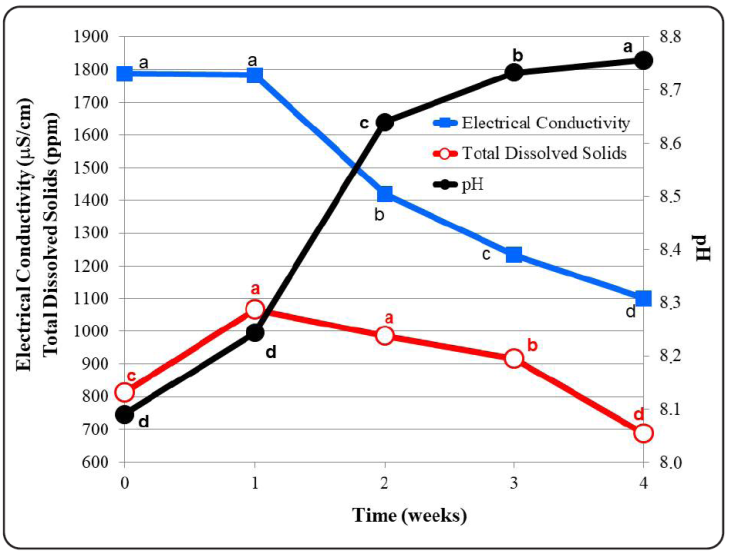 | Electrical Conductivity (μs/cm) | 1,784±4.48a | 973±23.71b | 753±38.35c | 1,500 |