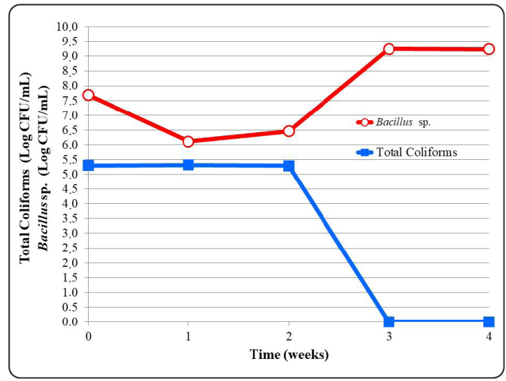 In addition, an antagonistic effect was observed between the microorganisms that make up the MM2 mixture and the coliforms, since the presence of the latter was not detected in the plate counts carried out during the last two weeks of the study (Figure 8). The statistical tests applied showed the existence of significant differences (p < 0.05) between the populations of the microorganisms accounted during this study. This result coincides with that indicated in various investigations, about the ability of Bacillus species to reduce the population of coliforms such as Escherichia coli, Shigella spp., Klebsiella pneumoniae, Enterobacter aerogenes, among others (Bhoonobtong, Sawadsitang, Sodngam & Mongkolthanaruk, 2012; Vijayaram & Kannan, 2015; Sharif et al., 2016, Tariq, Sudha & Reyaz, 2016),