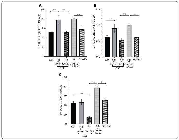 Figure 5 The response of pulmonary fibroblasts to the conditioned medium of A549 epithelial cells exposed to CSE or transfected with CCL2. A) Real-time PCR of TGFB1 in fibroblasts. B) Real-time PCR of ACTA2 in fibroblasts. C) Real-time PCR of IL6 in fibroblasts (** p˂0.01). Ctrl: Control cells; Fib + A549: Fibroblasts stimulated with conditioned medium from A549 cells exposed to CSE; Fib + shCCL2: Fibroblasts stimulated with conditioned medium from A549 cells that do not express CCL2 and that were exposed to CSE; Fib + A549 CCL2: Fibroblasts stimulated with conditioned medium from A549 cells that overexpress CCL2; Fib + EV: Fibroblasts exposed to conditioned medium of cells A549 transfected with the empty vector.