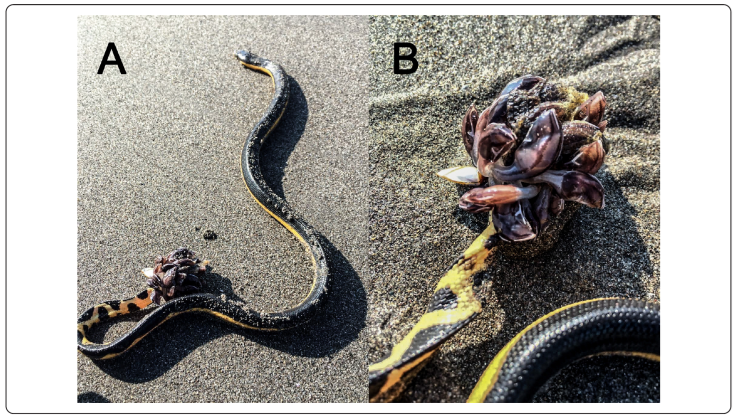 El especimen de H. platurus midió del hocico a la cola 61.97 cm. En la región caudal de este organismo se contaron 23 percebes de la especie C. virgatum (Figura 2), cada uno con una longitud de aproximadamente 1.2 cm. Durante la identificación, la circulación interna de los percebes era visible a través de su exoesqueleto traslúcido. En campo se observó que la locomoción de la serpiente marina era entorpecida por los percebes. El elápido fue reubicado a unos metros del punto de recolección, en una zona no transitada por el turismo para resguardo tanto de la integridad física de las personas como del reptil que se mantuvo pasivo.