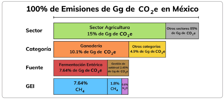 De acuerdo con el Segundo Informe Bienal de Actualización ante la Convención Marco de las Naciones Unidas sobre el Cambio Climático (CMNUCC) del año 2018, las emisiones de México en el 2015 fueron de 699,564.28 Gigagramos de dióxido de carbono equivalente (Gg de CO2e), sin considerar a los sumideros de CO2 (Secretaría de Medio Ambiente y Recursos Naturales & Instituto Nacional de Ecología y Cambio Climático, 2018). De esta cantidad, el sector de la Agricultura contribuyó con el 15% (102,059.5 Gg de CO2e) de las emisiones totales del país, de las que el 10.1% (70,567.6 Gg de CO2e) fueron generadas por la ganadería. Para esta última, los GEI contabilizados fueron los generados en la fermentación entérica y en la gestión del estiércol (sin considerar las emisiones por la producción de piensos), que aportaron el 7.64% (53442.72 Gg de CO2e) y el 2.45% (17,124.88 Gg de CO2e) respectivamente. En la gestión del estiércol el 1.8% (12,688.80 Gg de CO2e) correspondió al CH4 y el 0.6% al óxido nitroso (4,436.08 Gg de CO2e) y en cuanto a la fermentación entérica la totalidad correspondió al metano (Secretaría de Medio Ambiente y Recursos Naturales & Instituto Nacional de Ecología y Cambio Climático, 2018) (Figura 1).