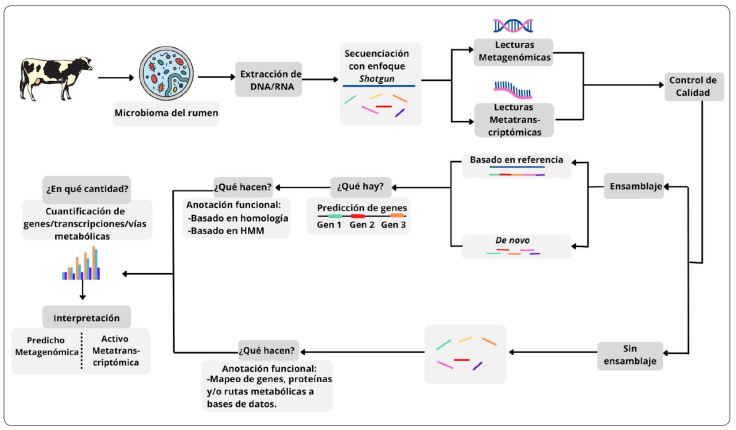 En esta revisión se muestra un panorama general del flujo de trabajo de los proyectos que utilizan la metagenómica y la metatranscriptómica, para el análisis del microbioma del rumen (Figura 4).