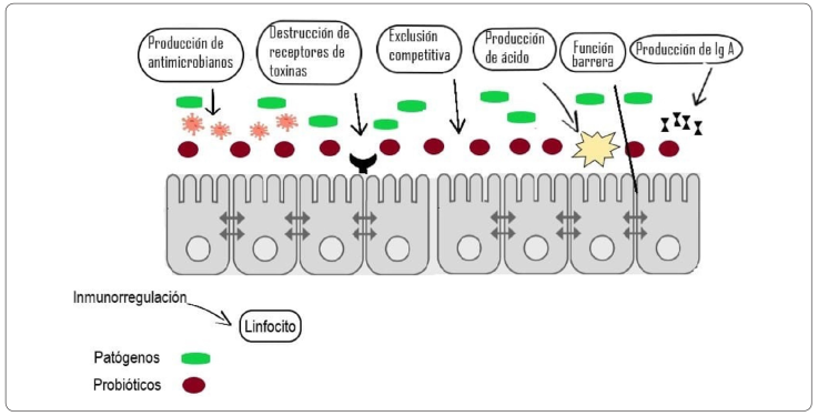 Figura 1 Mecanismos de acción de los probióticos a nivel de enterocitos. Modificado de (Olveira & González-Molero, 2016).