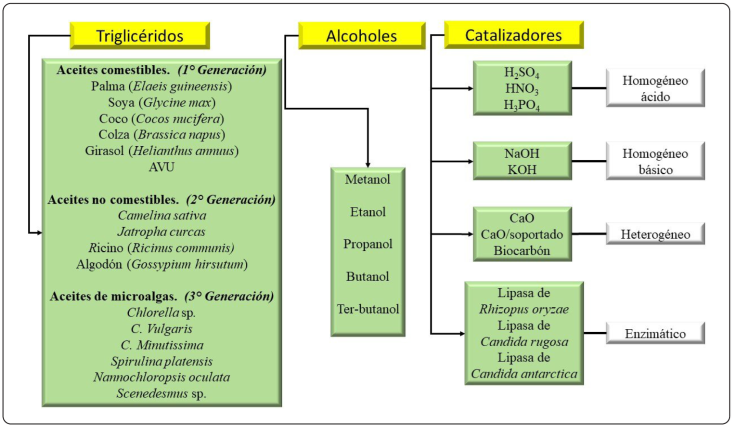 En el proceso de transesterificación se han utilizado diversas combinaciones de triglicéridos, alcoholes y catalizadores en diferentes fases, algunos de ellos se resumen en la Figura 2. Los triglicéridos están conformados por tres ácidos grasos unidos a una molécula de glicerol, el contenido y tipo de ácido graso, varía de acuerdo con el tipo de aceite, pueden ser saturados e insaturados (monoinsaturado o polinsaturado) (Akubude, Nwaigwe & Dintwa, 2019), los ácidos grasos tienen una longitud de cadena entre 15 y 22 átomos de carbono, los valores del número de cetano, poder calorífico, punto de fusión y la viscosidad se incrementan con la longitud de la cadena y disminuyen al aumentar la insaturación {Formatting Citation}, la estabilidad oxidativa y también el punto de obstrucción del punto en frío decrecen al incrementarse el grado de insaturación de los ácidos grasos (Talebi et al., 2013). En la Figura 3 se observan los tipos de ácidos grasos que contienen los aceites comestibles de primera generación y los aceites de las microalgas, de tercera generación, en los que predominan los ácidos grasos palmítico y oleico.