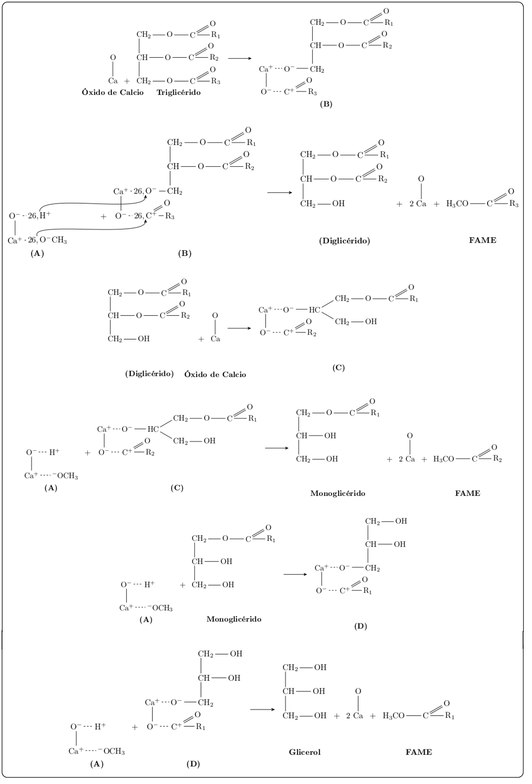 El mecanismo de reacción con un catalizador heterogéneo comprende la adsorción de uno o más reactivos en los sitios activos de la superficie del catalizador seguido de reacciones con otros reactivos. El mecanismo Eley-Rideal explica las reacciones catalizadas heterogéneamente, considera el primer paso como la absorción de reactivos gaseosos o líquidos en la superficie o sitios activos del catalizador. Las reacciones ocurren en la superficie o sitio activo del catalizador, es decir, los productos quedan absorbidos, posteriormente el producto se desorbe quedando libre para la continuación de la reacción, este mecanismo trata cada uno de los pasos como independiente y determinante de la velocidad de reacción (Malani et al., 2018). Para la reacción de transesterificación con metanol cuando se utiliza CaO como catalizador se inicia con la disociación del CaO para extraer un protón H+ del metanol y formar el ion metóxido de superficie, compuesto transitorio denotado por (A) (Maneerung et al., 2016) la reacción se muestra en la Figura 6, el CaO reacciona con el triglicérido para formar la especie (B), la interacción de A y B, conduce a la formación del diglicérido, y la regeneración consecuente del catalizador y la primera molécula de FAME; el diglicérido reacciona con el CaO para formar la especie intermedia (C) que posteriormente se combina con la especie (A) para generar un monoglicérido, la regeneración del catalizador y la segunda molécula de FAME, el monoglicérido reacciona con la especie (A) para formar el intermediario (D) que al interactuar con otra molécula (A) forma el glicerol, regenera el catalizador y la tercera molécula de FAME, las reacciones se muestran en la Figura 7 (Pasupulety, Gunda, Liu, Rempel & Ng, 2013). Una ventaja del CaO como catalizador es que se puede obtener de las materias primas como el estiércol de pollo, hueso de cabra y cáscaras de huevo (Maneerung et al., 2016; Mamo & Mekonnen, 2020; Khatibi et al., 2021).