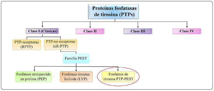 Figura 2 Clasificación general de las fosfatasas de tirosina (PTPs). La marca roja indica la ubicación de la PTP-PEST en la clasificación.