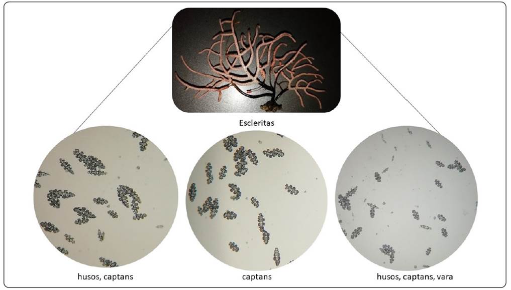 Figura 1 Leptogorgia alba y morfología de las escleritas obtenidas del organismo para la identificación del octocoral (Soler-Hurtado et al., 2017).