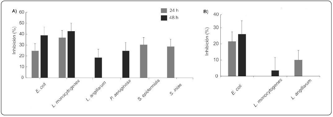 Figura 3 Efecto inhibitorio de los sobrenadantes de las cepas B. australimaris (A) y Pseudoalteromonas sp. (B), en diferentes patógenos humanos y acuícolas a las 24 h (barras grises) y 48 h (barras negras). Ensayo en microplaca de poliestireno.