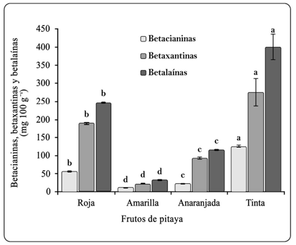 Figura 2 Contenido de Betalaínas (betacianinas y betaxantinas) en los distintos colores de los frutos de pitaya (Stenocereus thurberi ). Los valores corresponden al peso húmedo. Letras diferentes sobre la barra indican diferencia estadística significativa usando la prueba de Tukey (P ≤ 0.05). Barras verticales corresponden a la desviación estándar.