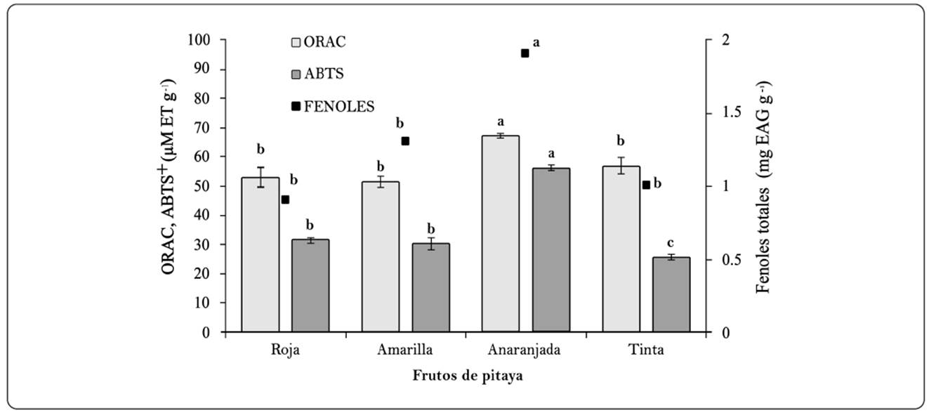 Figura 3 Capacidad antioxidante (ORAC y ABTS+) y contenido de fenoles totales en los distintos colores de los frutos de pitaya ( Stenocereus thurberi ). Los valores corresponden al peso húmedo. Letras diferentes sobre la barra indican diferencia estadística significativa usando la prueba de Tukey (P ≤ 0.05). Barras verticales corresponden a la desviación estándar.