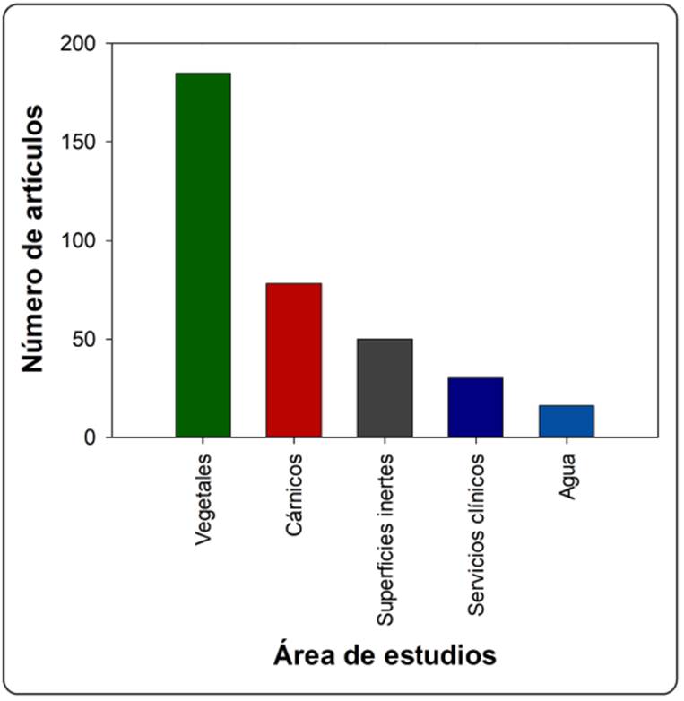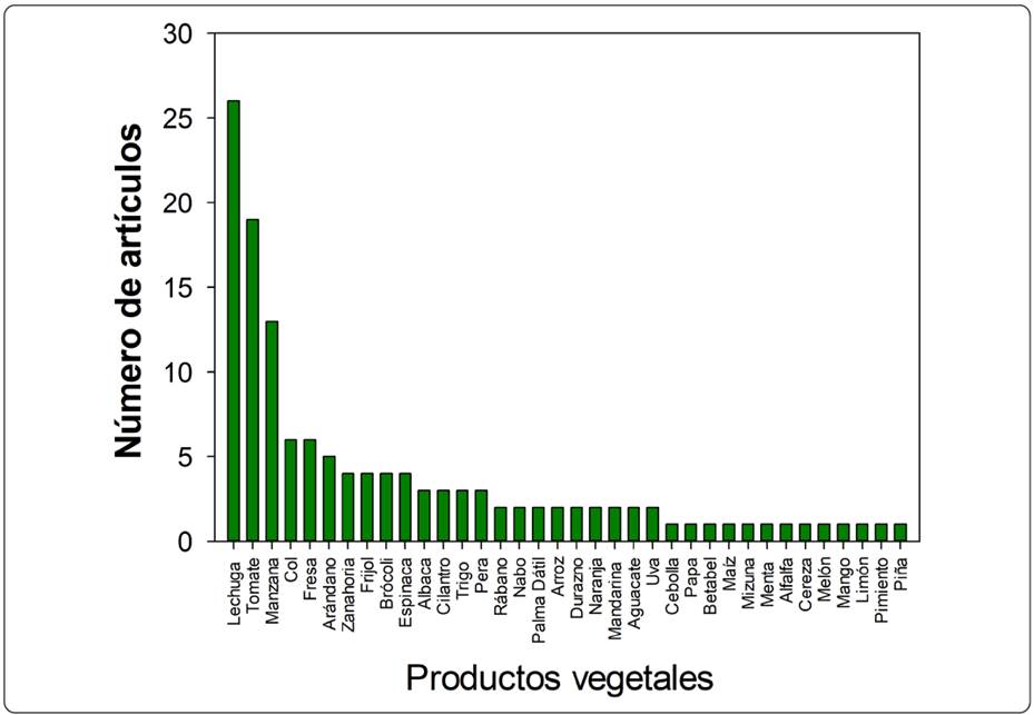 En la revisión bibliográfica, son 363 artículos los que tratan sobre la aplicación del AEN, 124 se refieren a verduras y legumbres, 41.9% a granos, aunque es en este último donde más se aplica (Figura 2) y 62 en las frutas, lo que representa el 20.9% y tercer lugar de estudio. Si se unifica la literatura de frutas y verduras el subtotal es de 186 artículos o sea un 51.2% del total analizado. En el caso de las verduras y legumbres, la lechuga es motivo de estudio en 26 lo que equivale a un 20.9% y un 7.1% del total de artículos, es probable que esta hortaliza al ser la tercera de mayor consumo mundial e ingerirse cruda y previamente desinfectada, explica el índice de artículos que la refieren, en comparación con las papas y los champiñones que para su consumo el grado de proceso es mayor.