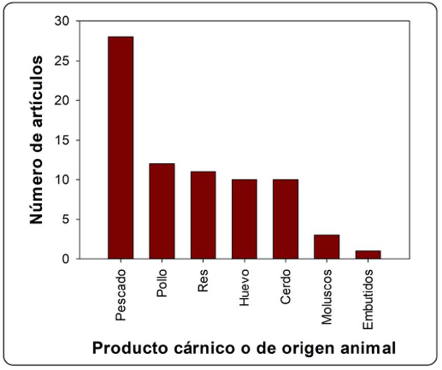 En la revisión de la literatura de los alimentos de origen animal la cifra fue de 78 artículos el equivalente a un 21.5 %, y ocupa el 2° lugar en el área aplicada (Figura 2). El tipo de carne con más presencia en estos artículos es la del pescado con 27 artículos (34.6 %), y a su vez representa un 7.4 % de lo consultado (Figura 4), lo anterior, es probable porque en los países asiáticos es en donde se desarrolló esta tecnología del AE y se consume más esta carne en comparación con los países del continente americano que es la de pollo. Por otro lado, el alto índice de mención del uso del AEN en los pescados y los mariscos, refleja la necesidad de reducir la carga microbiana en ellos, ya que por lo general se ingieren crudos, a diferencia de la carne roja y el pollo que se procesan térmicamente.