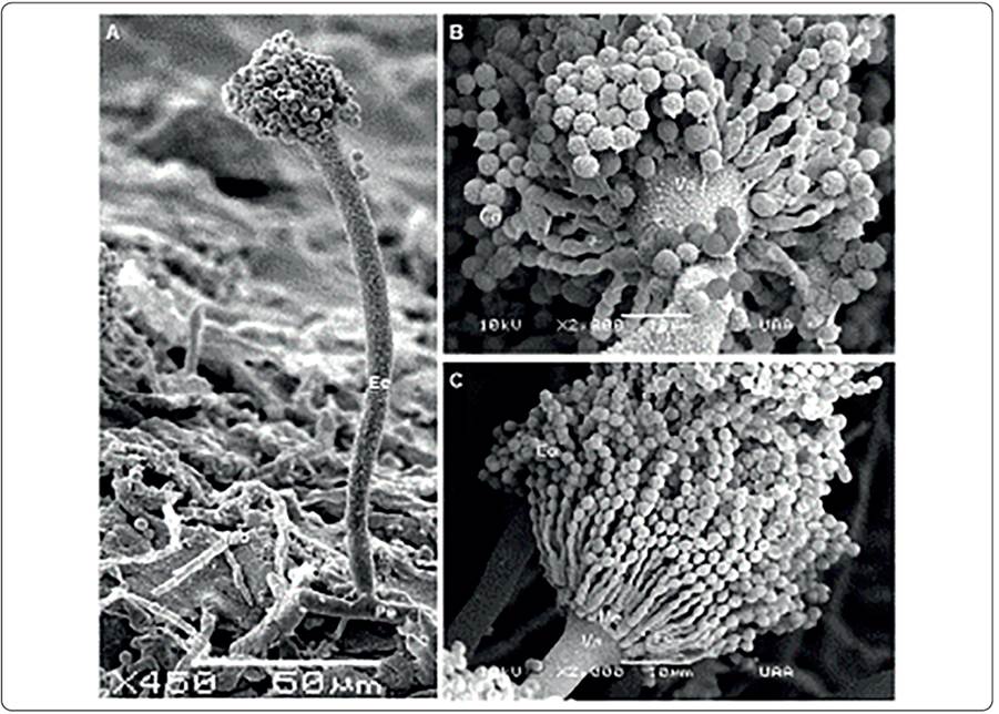 Figura 1: Estructuras morfológicas del género Aspergillus. Conidióforo: Cc = Cabeza conidial, Ee = Estípite, Pe = Célula pie, Mo = Micelio. Cabeza conidial uniseriada: Co = Conidio o espora; Fe = Fiálide, Va = Vesícula. Cabeza conidial biseriada: Co = Conidio, Fe = Fiálide, Va = Vesícula, Me = Métula.