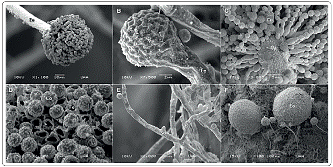 Figura 2: Estructuras morfológicas de Aspergillus flavus. Cc = cabeza conidial, Ee = estípite, Va = vesícula. Conidióforo. Fe = fiálide, Co = conidio. Cc = conidio, Fe = fiálide. Mo = micelio, So = septo. Esclerocio = Eo. Esclerocio = Eo.