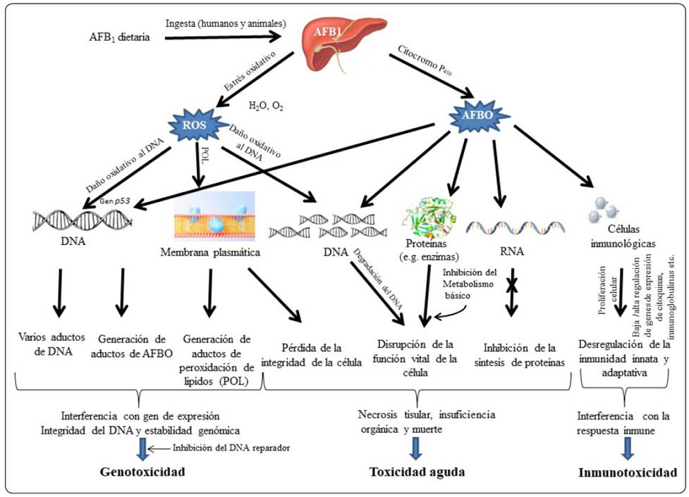 La Figura 3 resume los diferentes mecanismos de toxicidad de la AFB1 y cómo las especies reactivas de oxígeno (ROS) y el metabolito AFBO causan genotoxicidad, inmunotoxicidad e intoxicación aguda al actuar sobre el DNA genómico, así como la afectación a las macromoléculas funcionales y a las células inmunológicas como las inmunoglobulinas y las citocinas (proteínas que controlan el crecimiento y la actividad de las células del sistema inmunológico y de las células sanguíneas) (Benkerroum, 2020).
