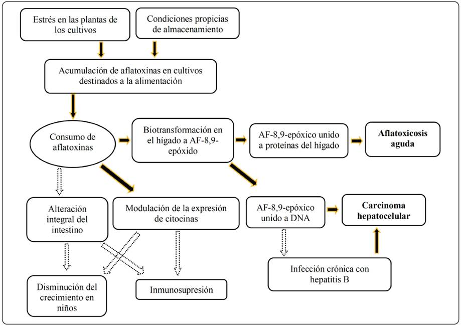 El consumo de alimentos contaminados con altas concentraciones de AFs, provoca aflatoxicosis aguda, necrosis hepática, hemorragia y edema. Por consiguiente, el efecto crónico por la ingesta de alimentos con bajos niveles de AFs está asociado con los trastornos en la digestión, una mala absorción y deficiencia en el metabolismo de los nutrientes, cirrosis y desarrollo del carcinoma hepatocelular (CHC). También los estudios epidemiológicos establecen una asociación entre la exposición a las AFs y el desarrollo del CHC en las poblaciones con bajos o medianos ingresos, principalmente de África y Asia (Meneely et al., 2022).