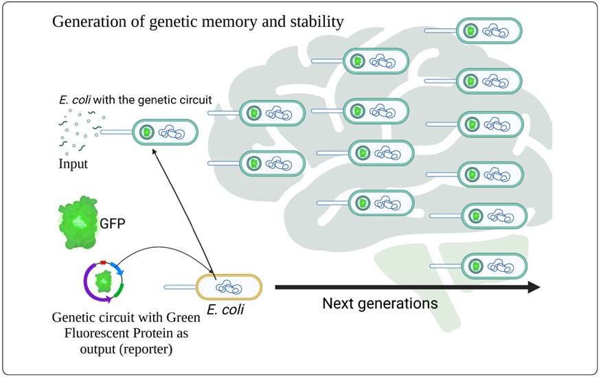 Figure 2 (Genetic memory): Stability of the memory generated by a genetic circuit introduced into E. coli (yellow cell) that responds to an input and through the interactions that this generates within the internal circuit (Plasmid with Green Fluorescent Protein) is able to generate a series of actions that will allow the next generations (green cells with GFP plasmid) to “remember” these interactions and maintain the main function of the circuit that in this case is the production of GFP for several generations without the need to be exposed to the input or stimulus again.