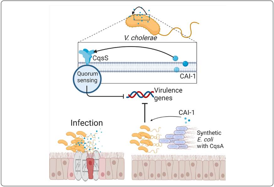 Figure 4 Generation of a genetic circuit by quorum sensing for cholera treatment in mice. By using several synthetic E. coli that expressed CAI-1, it was possible to use the regulation machinery of V. cholerae and thus achieve the reduction of the disease produced by this pathogen in mice that were used for this experiment.